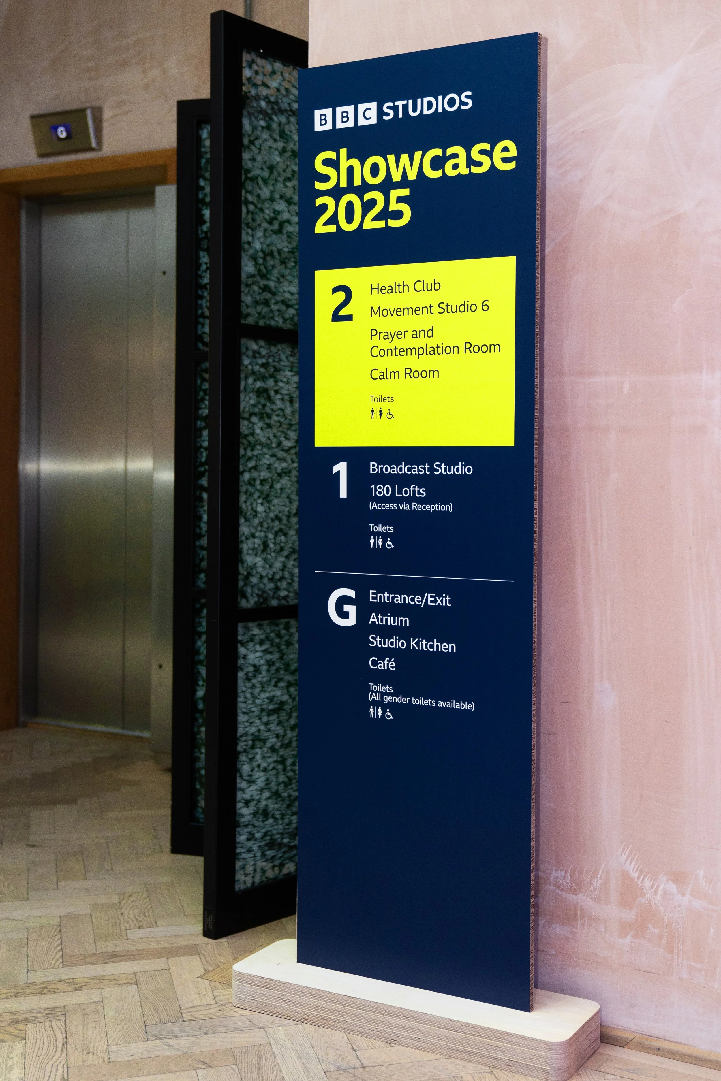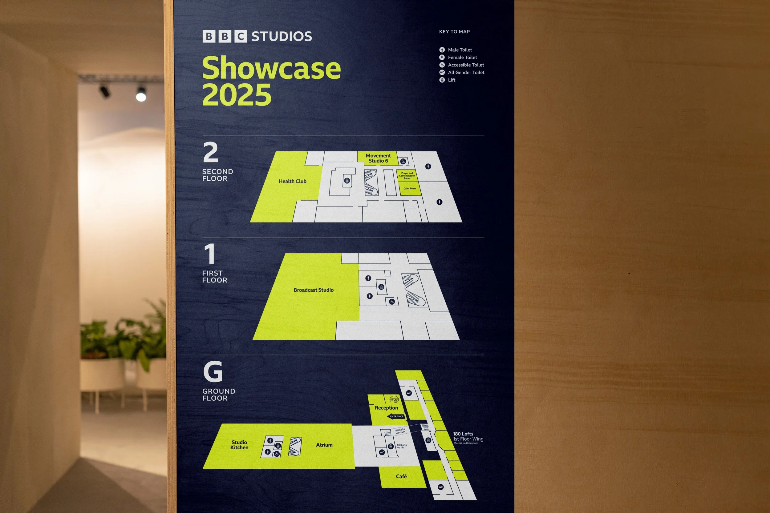 Since the venue was split over 3 floors, we designed a map and a wayfinding system to help navigate the building. This included free standing signage, vinyls, maps and lift signage.